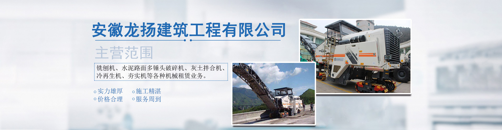 安徽龍揚建筑工程有限公司是一家知名的大型建筑機械租賃企業之一。公司管理完善,組織機構健全,技術力量雄厚。經營范圍:銑刨機、水泥路面多錘頭破碎機、灰土拌合機、冷再生機、夯實機、攤鋪機、挖掘機、粉料撒布車、平地機、清掃機、壓路機等各種機械租憑業務。另承接石灰、沙石、水穩攤鋪等業務。廣泛服務于農業建設、小區綠化、場地平整、鐵路、高速公路等建設。公司業務范圍廣泛,在外省等地服務過數百處大中型建筑工程,與客戶建立了良好的合作關系,參加建設了云南、四川、貴州等省市區數百處市工程和大型公建及住宅項目,公司成立以來通過嚴格的管理和務實的經營理念,在同行業中樹立了較高的信譽。